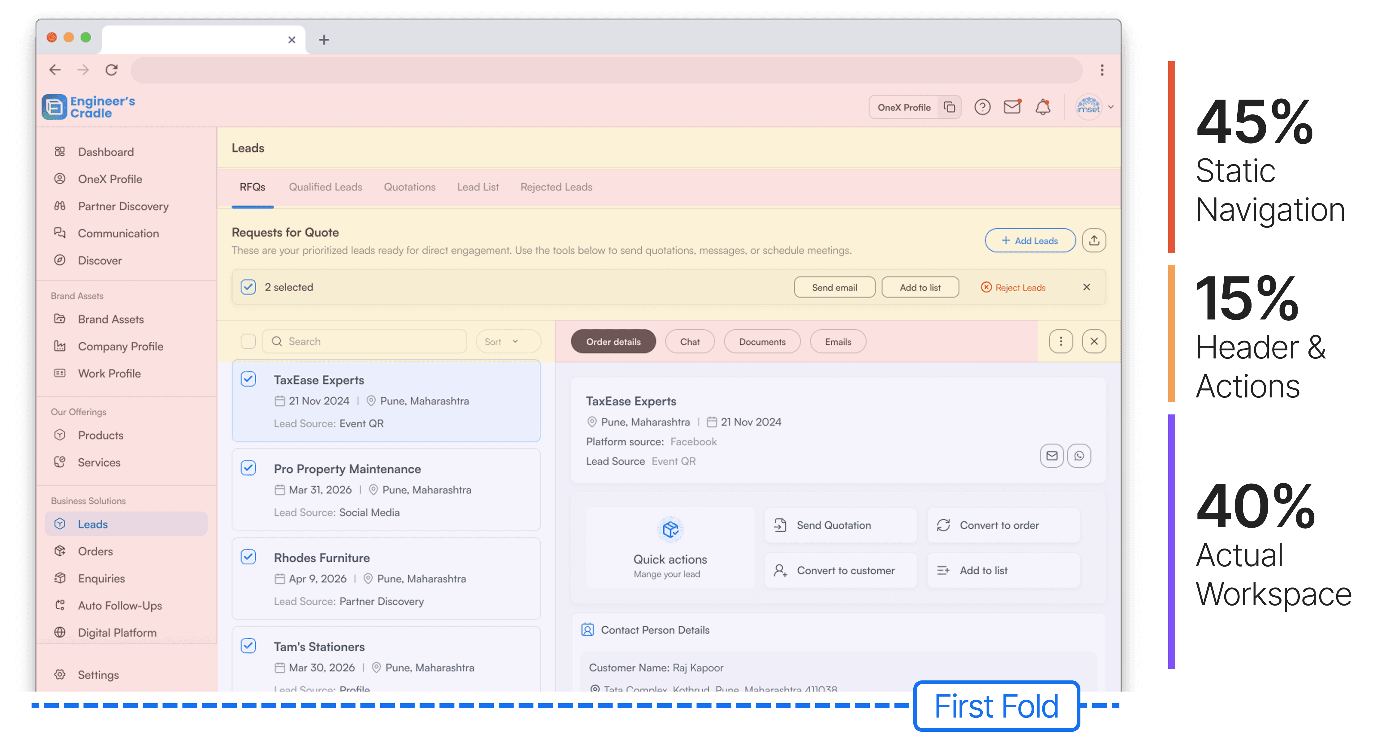 At Engineer’s Cradle, our dashboard was feeling claustrophobic. We’re a data-heavy platform where users manage CRM leads and track orders etc,—basically, they need to see a lot of info at once to do their jobs. The old design was eating up way too much space.